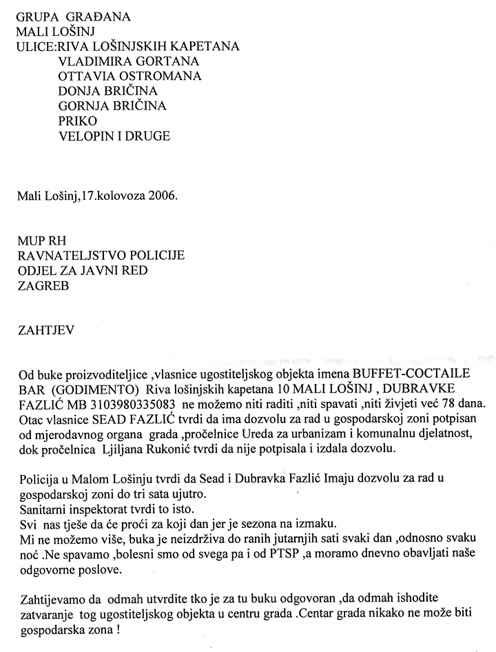 Danas je već 16. kolovoza 2006. Rekoše nam u policiji, glede gromoglasne buke Dubravke Fazlić koja je vlasnica Godimenta, Buffet-a Riva lošinjskih kapetana 10, da će uskoro proći ljeto pa da izdržimo utjecaj tog terora koji se na nas, građane, svaku noć bespoštedno vrši. Kažu nam to i sanitarni inspektori i poglavarstvo ovoga turističkog grada.